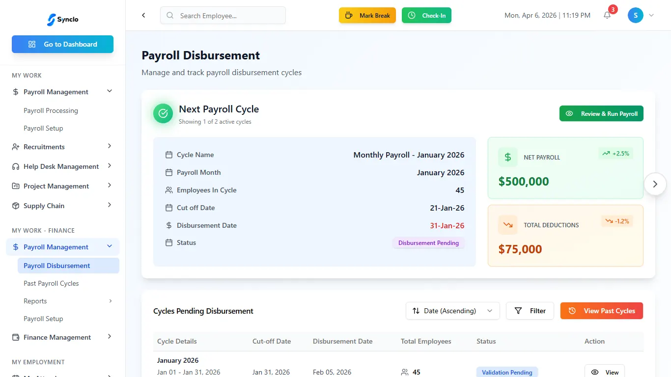 Simplify payroll processing from calculation to disbursement with Synclo’s advanced Payroll Management system. Automate salary structures, ensure compliance, and streamline approvals to deliver accurate, timely, and efficient payroll operations all in one platform.